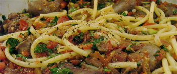 • When pasta is ready and drained, pour the tomato sauce into the saute pan with the sausages and onions add pasta and a little pasta water if not enough liquid. Toss together let pasta sit in sauce for 2 minutes.